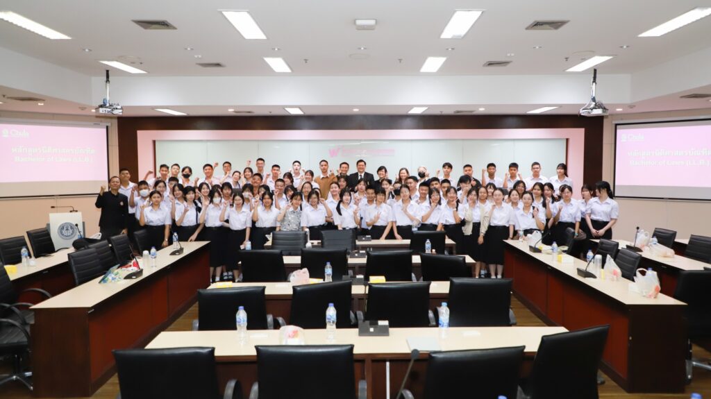 การนี้ ผู้ช่วยศาสตราจารย์ ดร.ณัชพล จิตติรัตน์ รองคณบดี ได้กล่าวต้อนรับและแนะนำภาพรวมของคณะ พร้อมเชิญชมวิดีโอแนะนำหลักสูตรนิติศาสตรบัณฑิต และหลักสูตรนิติศาสตรบัณฑิต สาขาวิชากฎหมายธุรกิจและเทคโนโลยี (หลักสูตรนานาชาติ) (หลักสูตร LLBel)