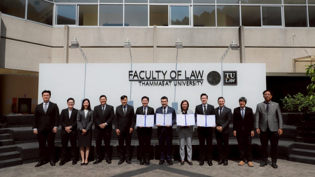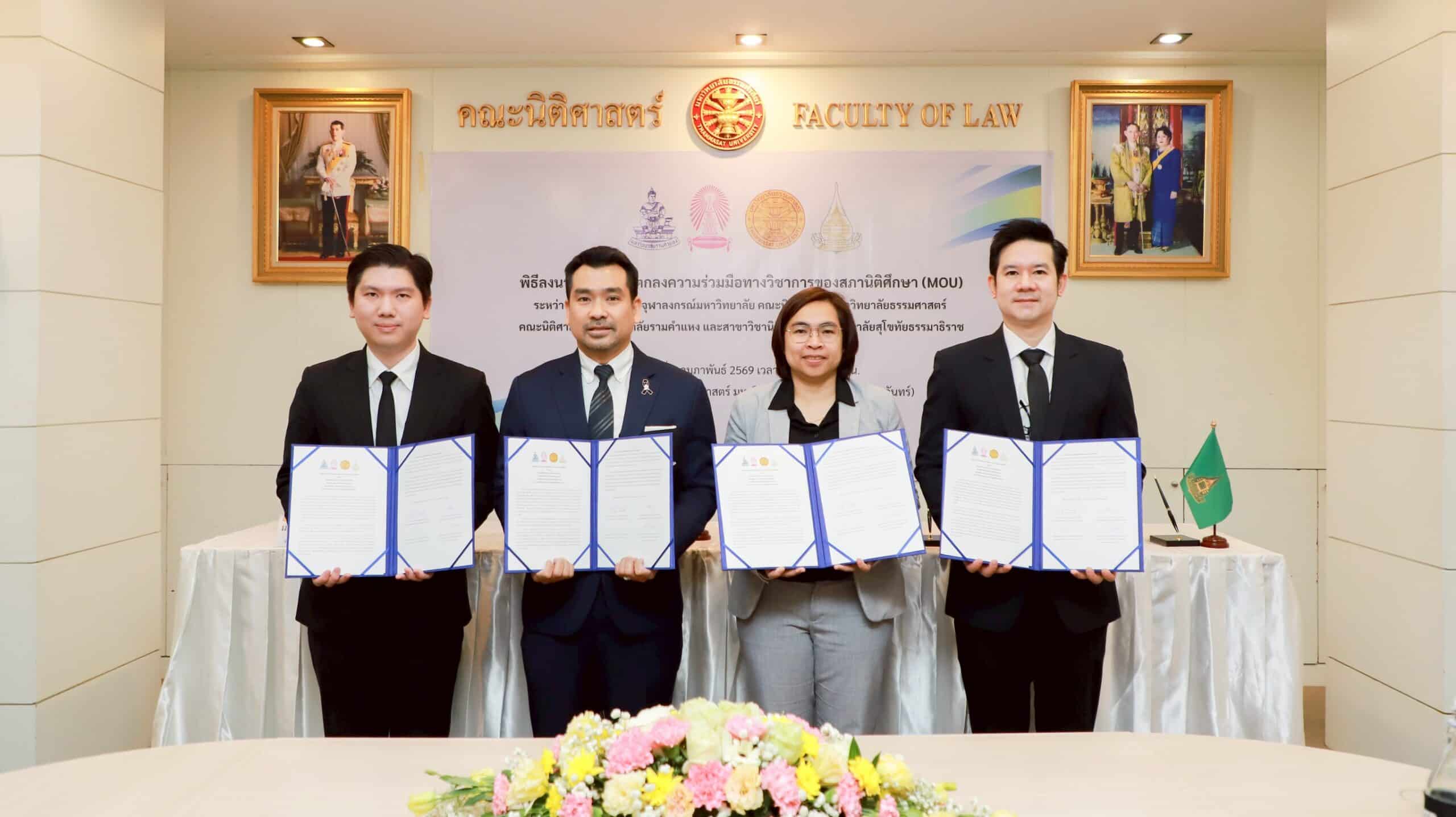 เมื่อวันจันทร์ที่ 2 กุมภาพันธ์ 2569 รองศาสตราจารย์ ดร.ศุภศิษฏ์ ทวีแจ่มทรัพย์ คณบดีคณะนิติศาสตร์ จุฬาลงกรณ์มหาวิทยาลัย รองศาสตราจารย์ ดร.สุปรียา แก้วละเอียด คณบดีคณะนิติศาสตร์ มหาวิทยาลัยธรรมศาสตร์ ผู้ช่วยศาสตราจารย์ ดร.สิทธิภาคย์ ภูริสินสิทธิ์ คณบดีคณะนิติศาสตร์ มหาวิทยาลัยรามคําแหง และผู้ช่วยศาสตราจารย์ ดร.พงษ์สิทธิ์ อรุณรัตนากุล ประธานกรรมการประจําสาขาวิชานิติศาสตร์ มหาวิทยาลัยสุโขทัยธรรมาธิราช ได้ร่วมกันลงนามบันทึกข้อตกลงความร่วมมือทางวิชาการของสภานิติศึกษา (MOU) ณ ห้องจิตติ ติงศภัทิย์ คณะนิติศาสตร์ มหาวิทยาลัยธรรมศาสตร์ (ท่าพระจันทร์)